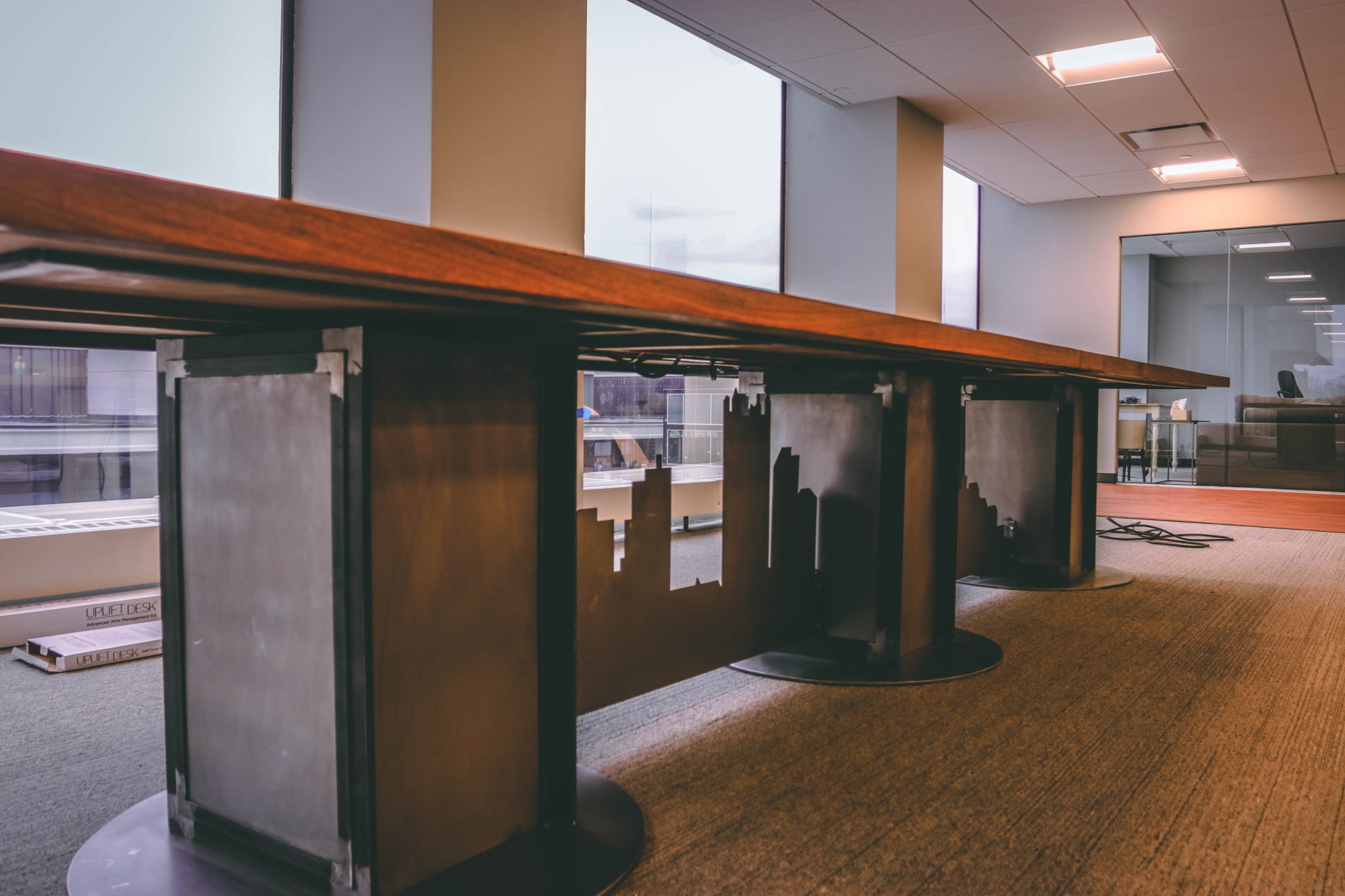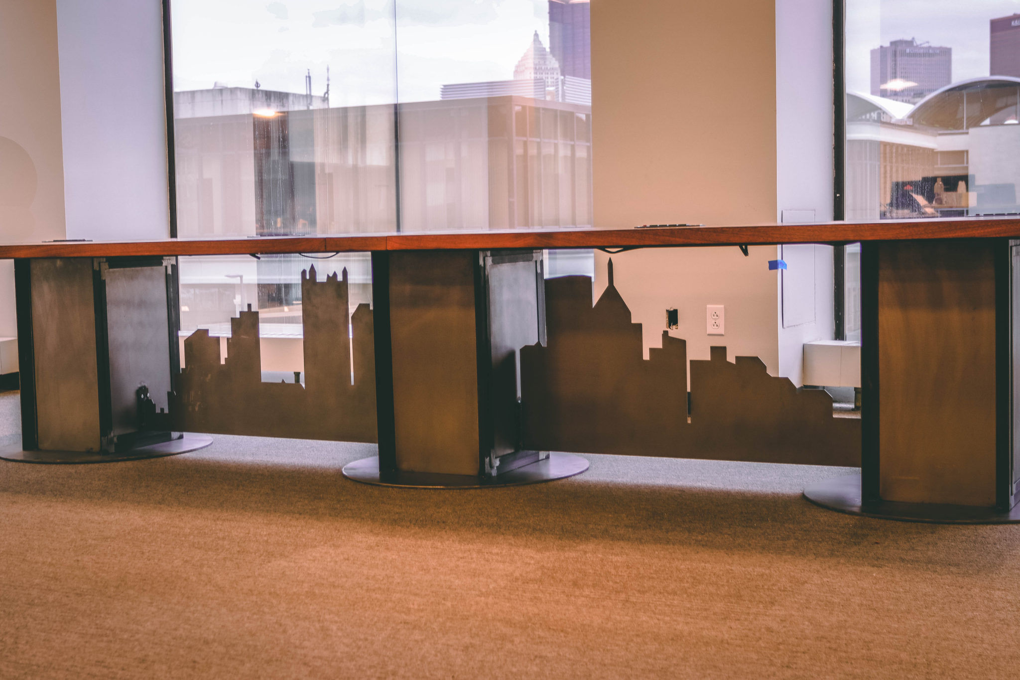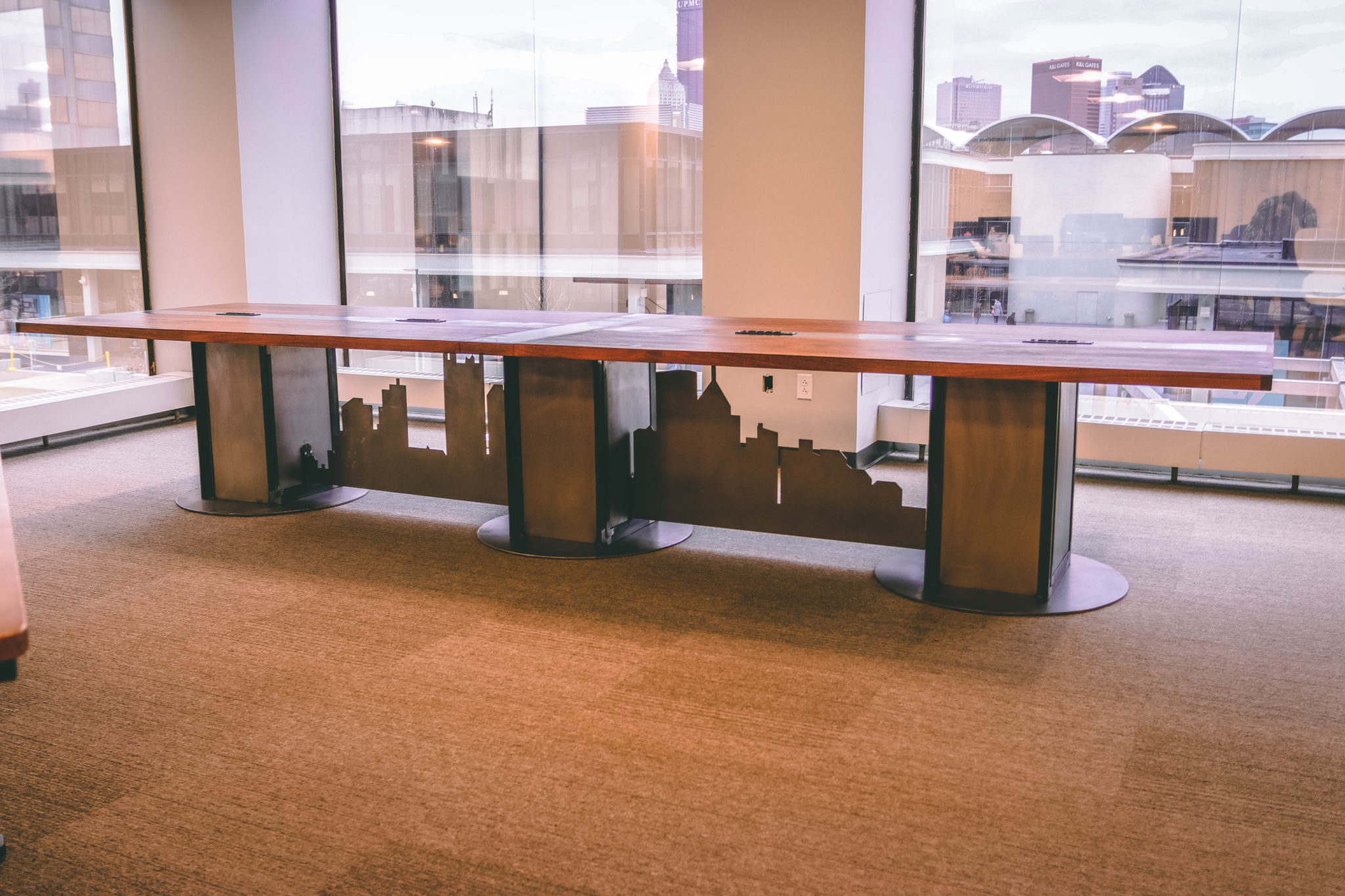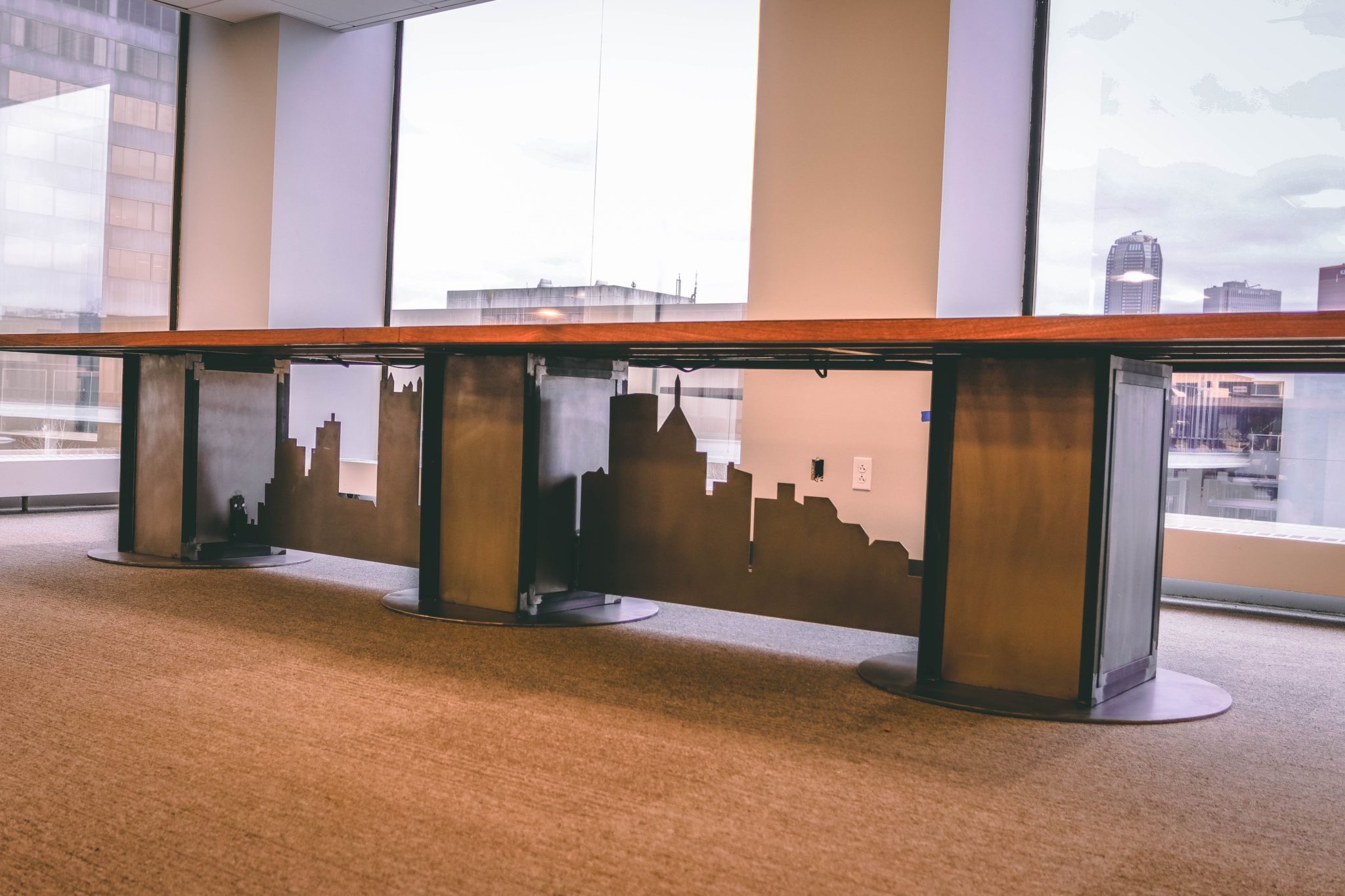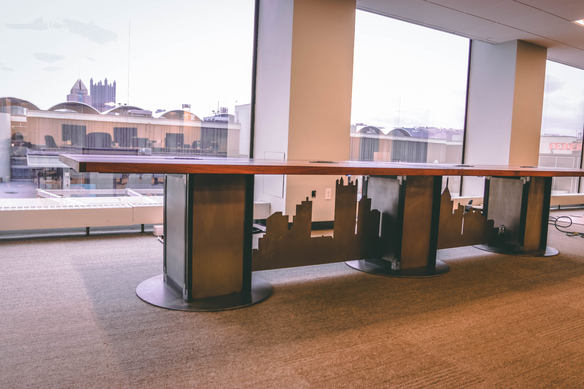This pieces features a plasma cut CNC metal skyline that spans underneath three custom metal pedestals. The top is made from veneered walnut with metal inlaid dividers. One of the issues with this build was the delivery. The building had some tiny elevators which I typically don’t have to deal with. Because of this we had to make the whole thing in parts and then assemble it on site. So, to do this we glued up the top in 3 sections. The two ends, and a center divider.