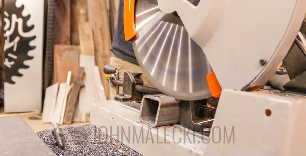 Cut down your metal stock to size. Cut the long pieces first for the stretchers, then cut the legs and cross members. You can use a chopping metal cutting saw, a bandsaw, or a zip wheel on a hand grinder. Bevel the edges on all butt joints.