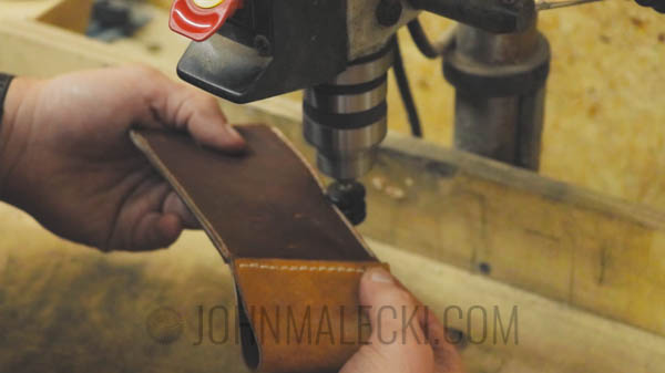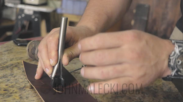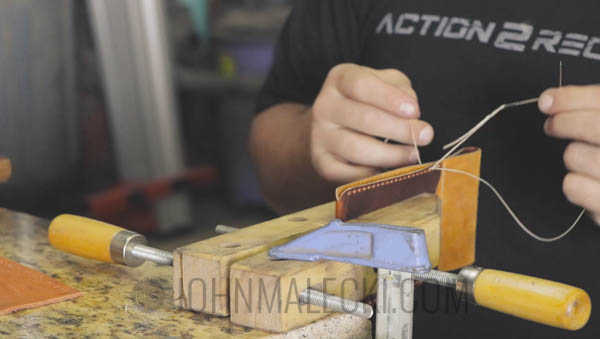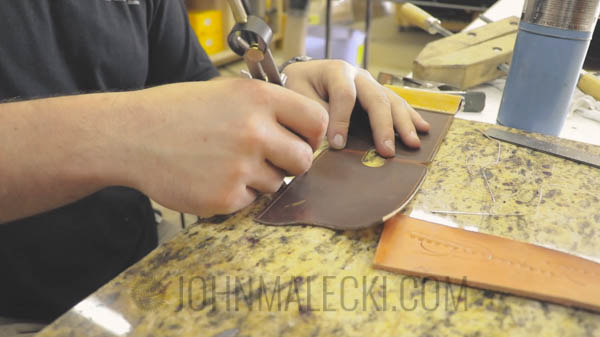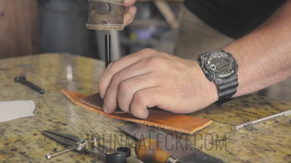 Use corner tool to taper base of the case. Then mark lines for the thread holes. Pre mark, and stamp the holes for the belt loop on both the front and loop flap. Then saddle stitch together