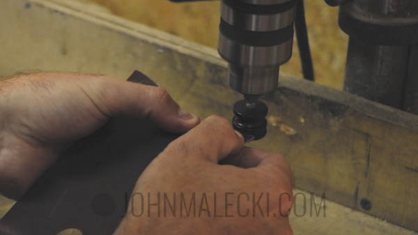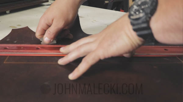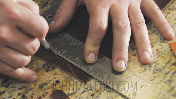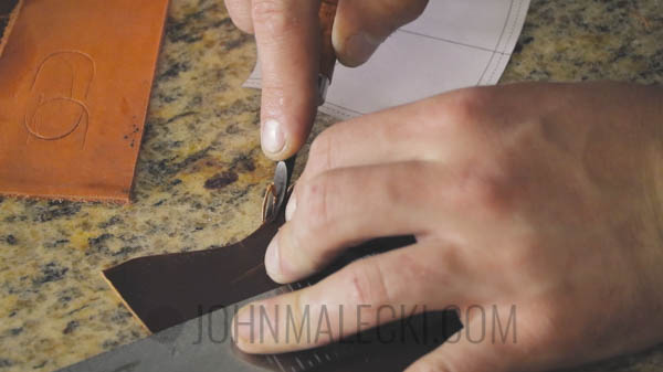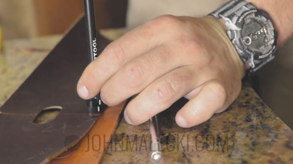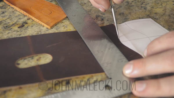 Center and punch the hole for the bottom of the case. Layout template for the curve on the top of the case, and cut with a sharp knife. Bevel the edge with your edge beveler.