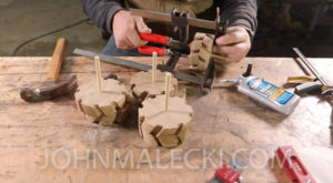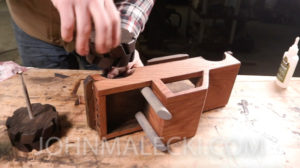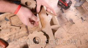 Glue up the wheels using the center hole for alignment. Then clean up the outside of the wheels using your hand plane and sander, and cut the center recess for the hub using a forestner bit.