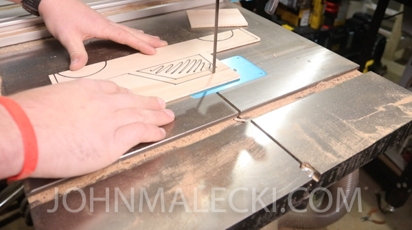 Using your template, layout and cut the side panels for the truck. Cut outside the lines using your bandsaw, being sure to leave some room to sand the piece to final dimensions. Once cut, then shape your two sides on a spindle sander, and then begin cutting the interior parts to your desired width.
